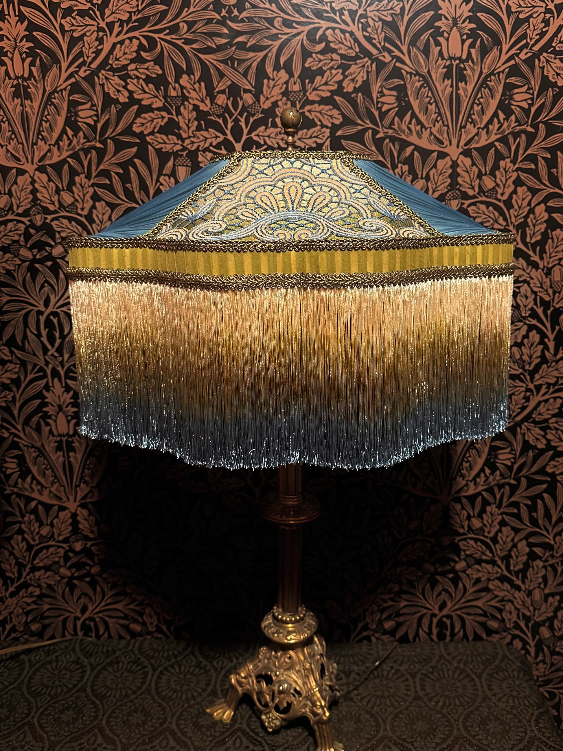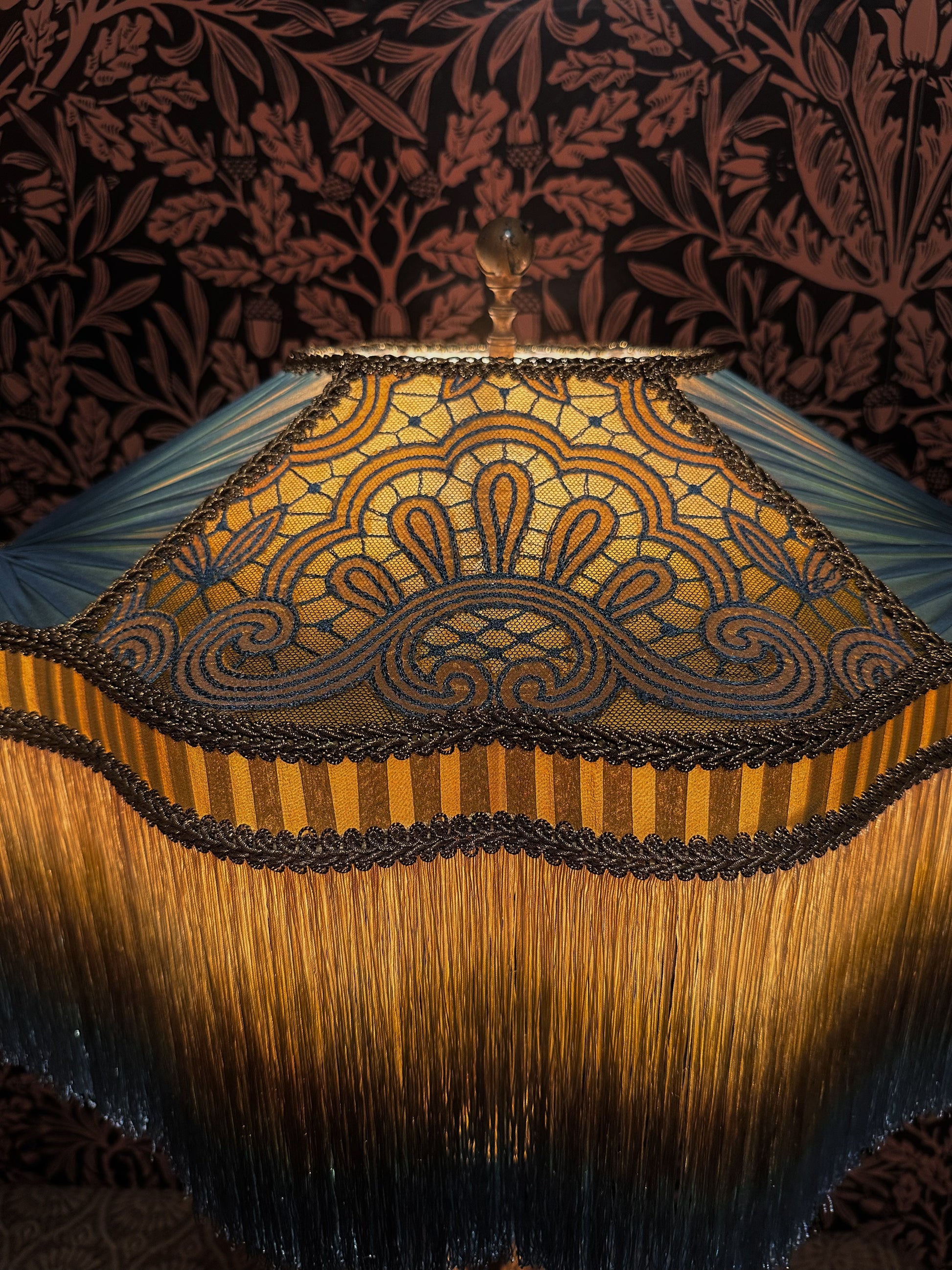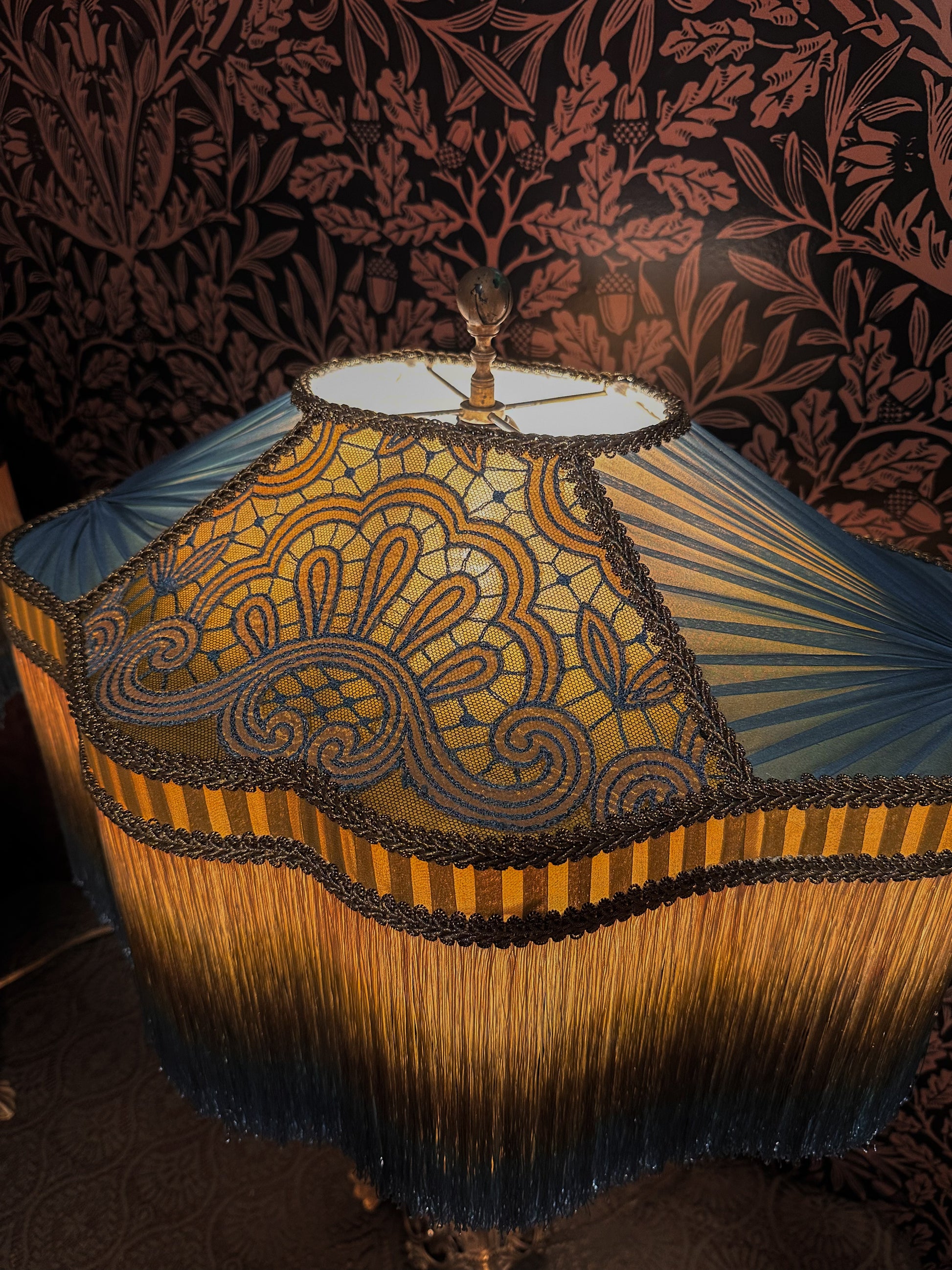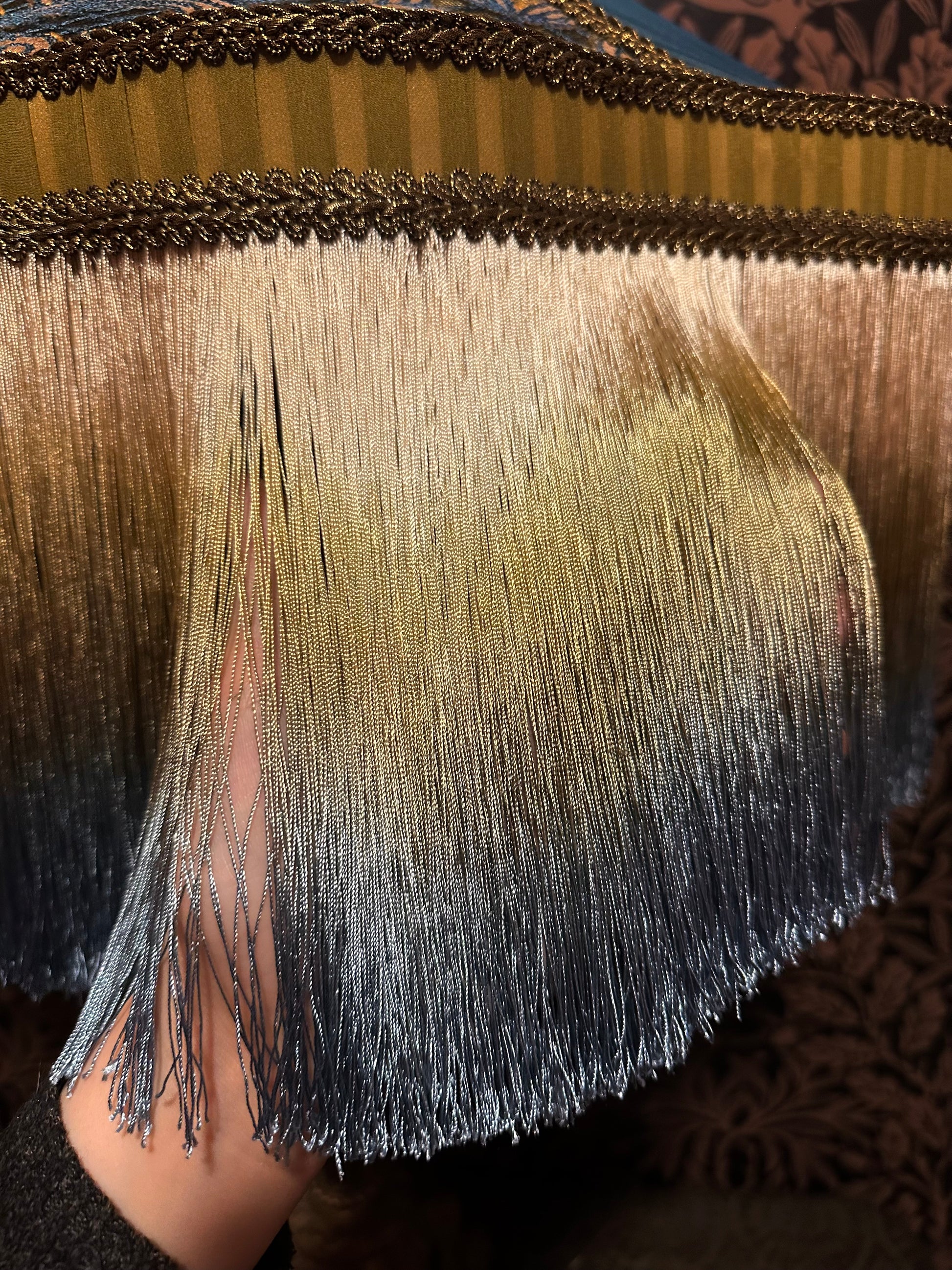 This is a matching pair of medium to large-sized lampshades in shades of cerulean blue, olive green, and gold. They're made with antique Edwardian-era embroidered tulle panels and custom-dyed cerulean and olive pleating layered over gold charmeuse. They're trimmed with long, hand-dyed gold, olive, and cerulean rayon twist fringe and metallic gold braid trim.