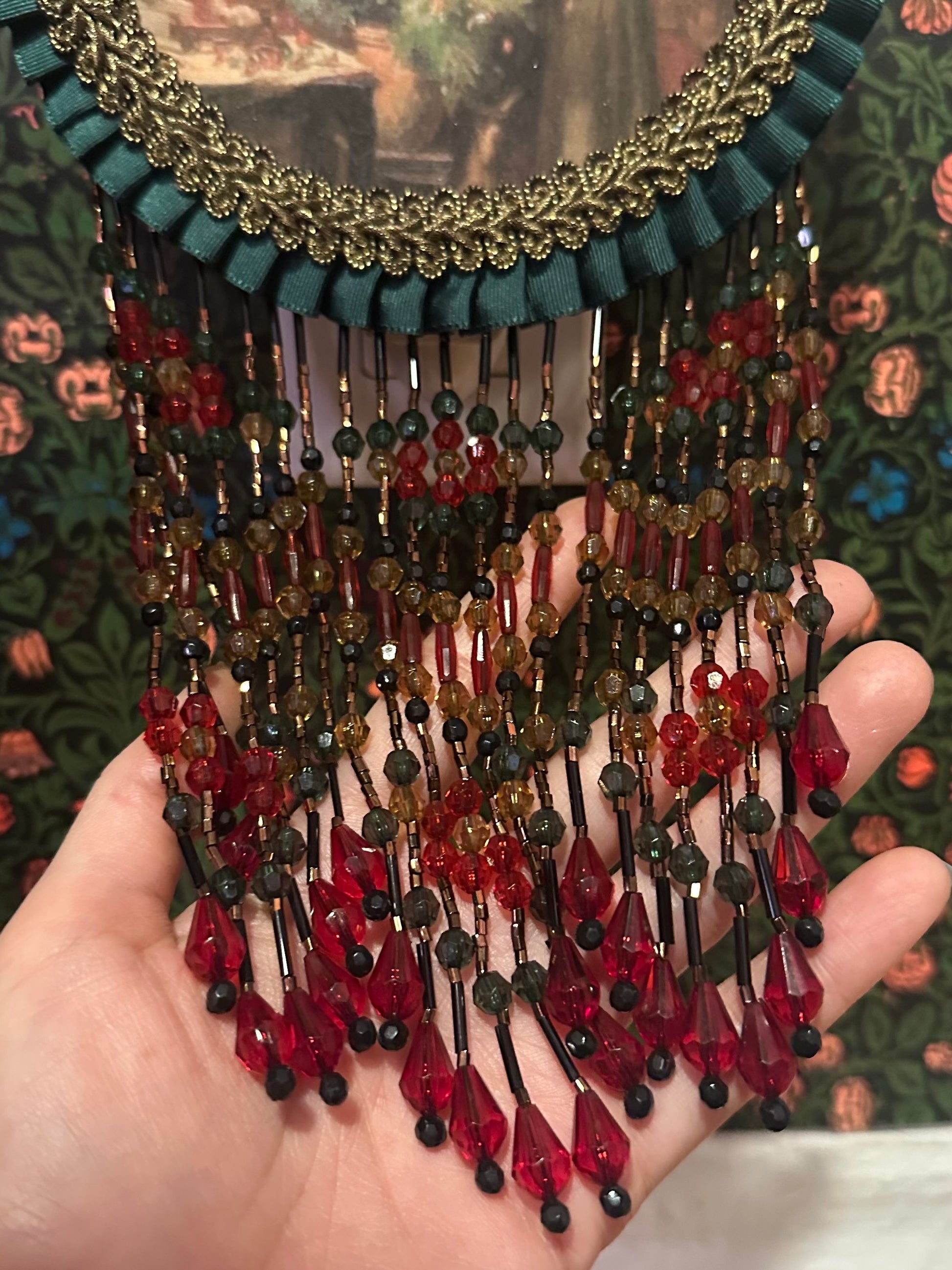 This is a small nightlight featuring Marcel Rieder’s painting “Decorating the Christmas Tree” c. 1898. It's trimmed with long red, green, gold and black beaded fringe, dark green knife pleated ribbon, and metallic gold braid trim.